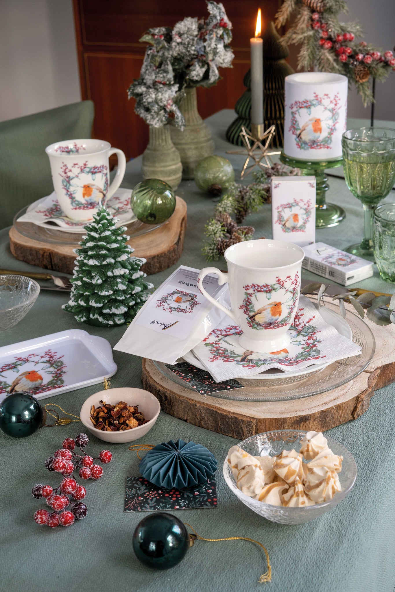 They come with matching table napkins, candles, and mugs for a perfect home decoration.