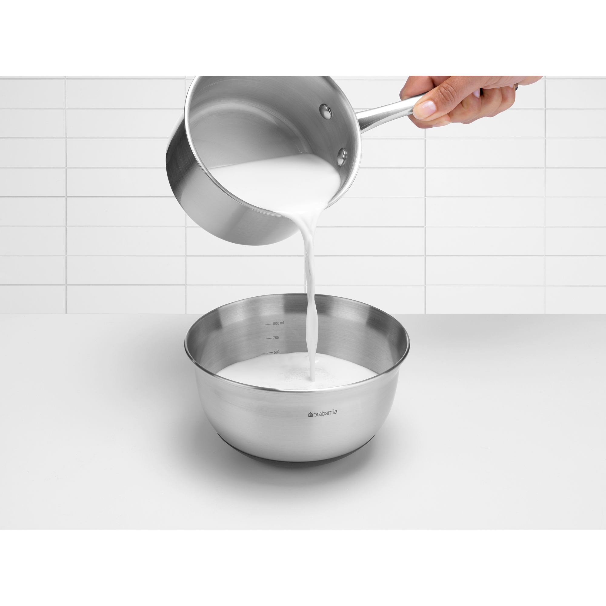 Completely happy when you can stir and mix? Stir up your style with the Brabantia Profile Mixing Bowl made of stainless steel. The measurements on the inside make mixing ingredients easy, the outside stirs up your style. Its gently curved edge is designed to hold the bowl in the optimal stirring position, whilst the silicone base prevents slipping - all heat resistant up to up to 220ºC/448ºF. A real super bowl!