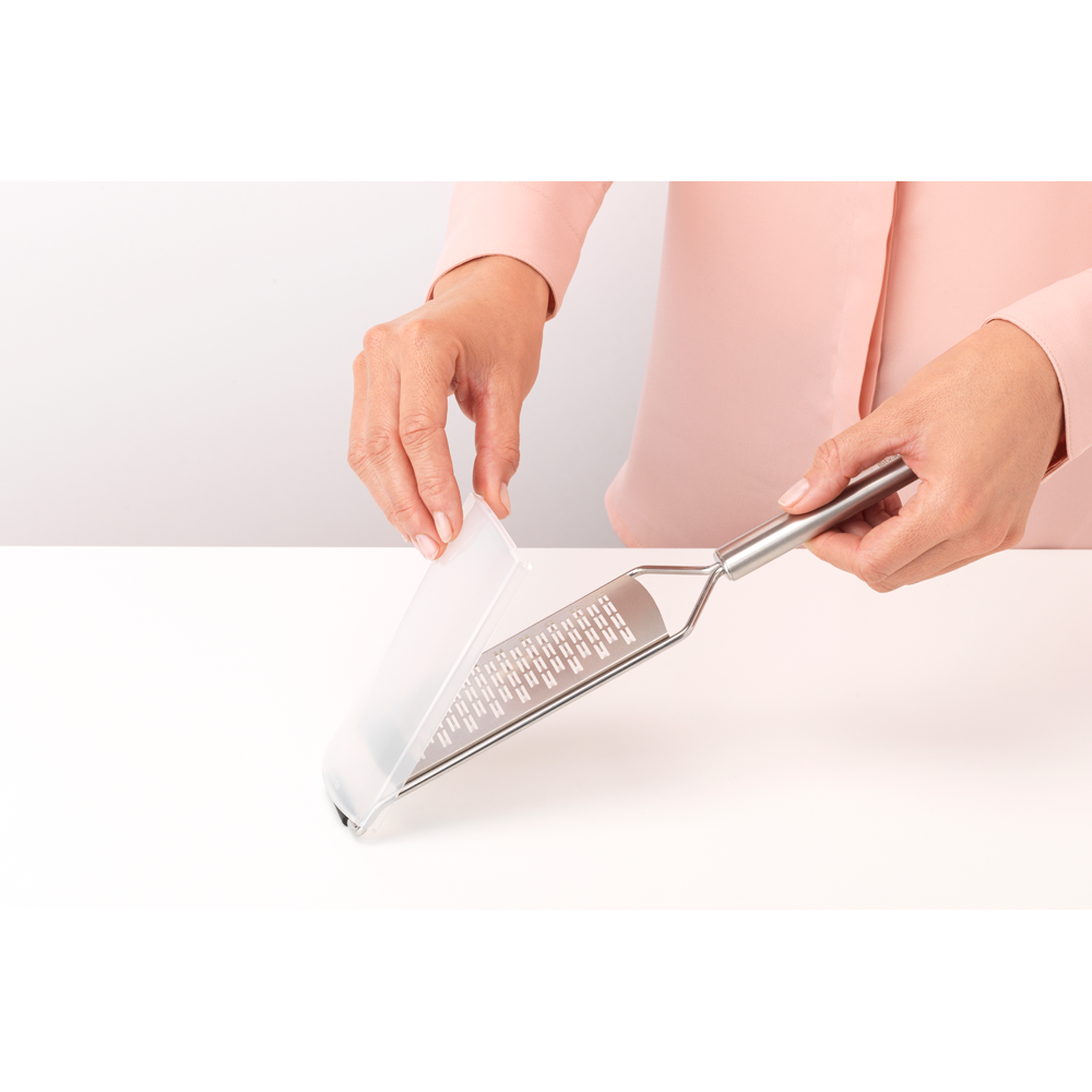 This Brabantia Slice Grater is ideal for Parmesan, cucumber, carrots, etcetera. It will even make you chocolate flakes, adding a sweet touch to your favourite dessert. The anti-slip base and large plate help you grate lightly. And after use you can store it securely because of the protective cover. Happy grating!