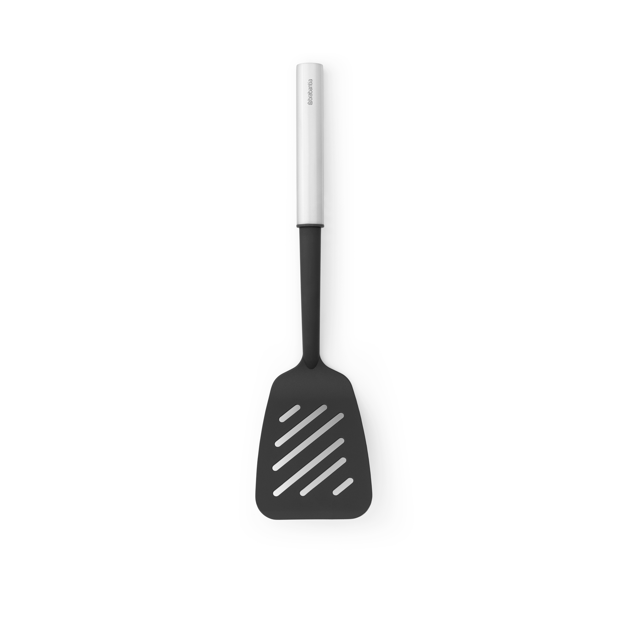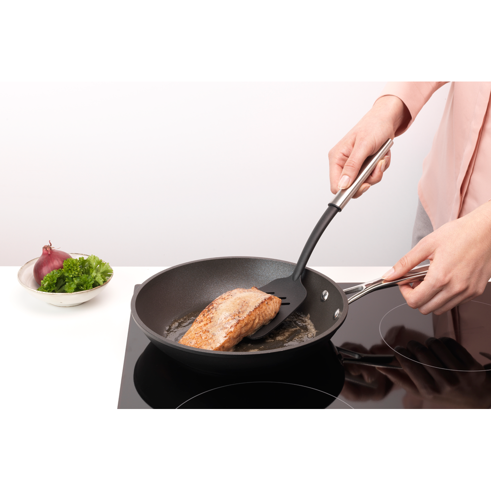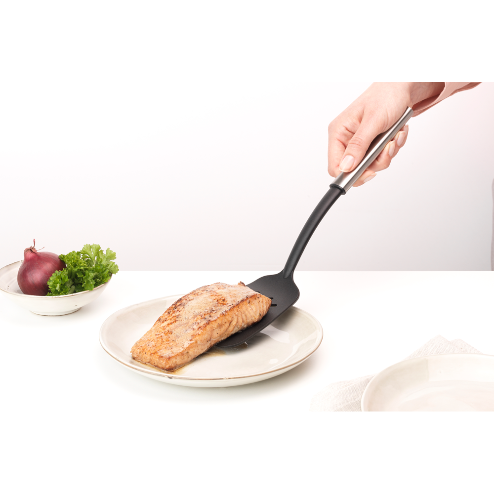 Eggs, meat, oven dishes… Flip them and serve them with this Brabantia Non-Stick Large Spatula. This sturdy spatula has smart slots through which fat can easily run off. And it's made of resilient nylon, so safe for your non-stick cookware too. A turn for the better!