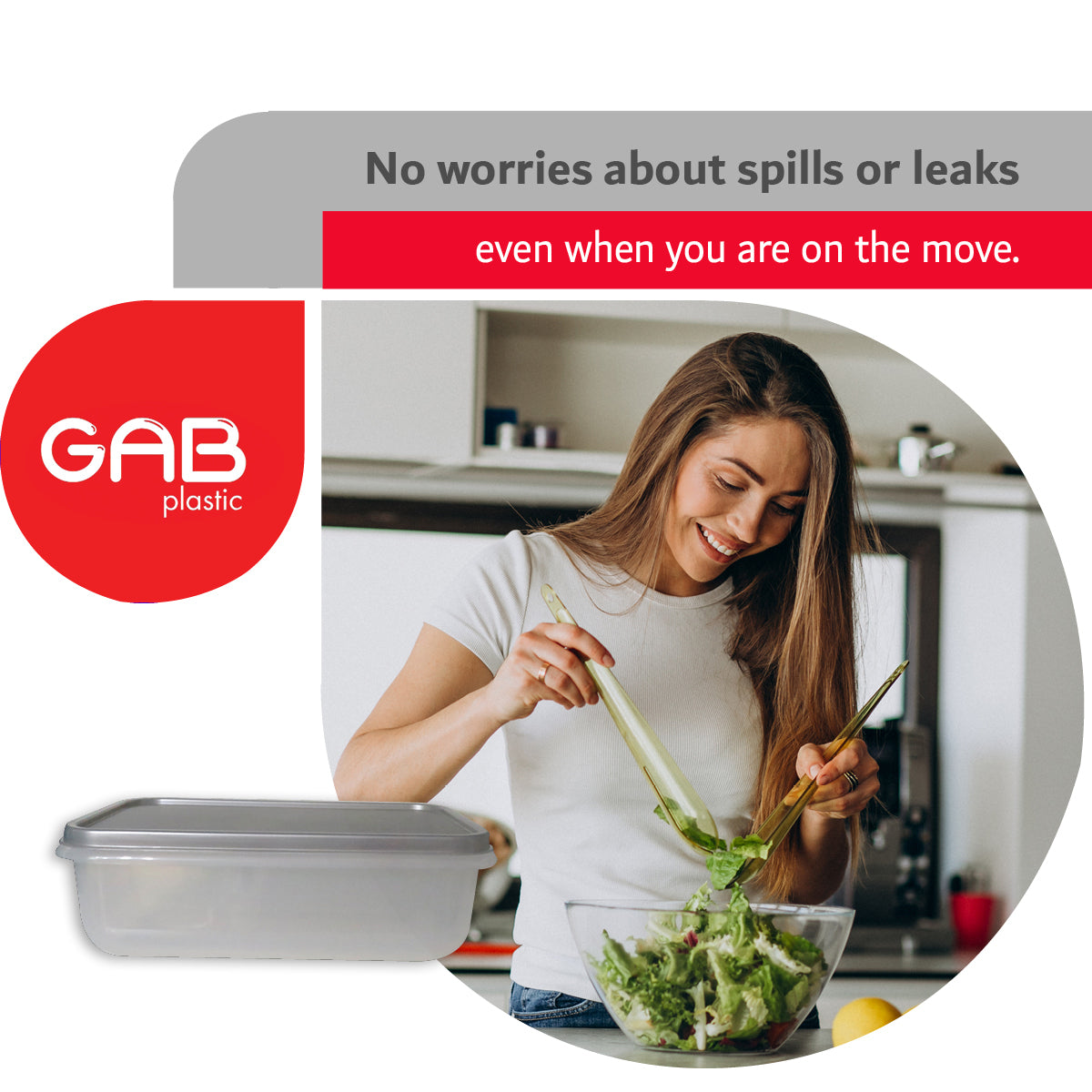 These food containers from Gab Plastic are great for storing food. They come with a clear bottom and colored lid for easier sorting. Made of high quality plastic.