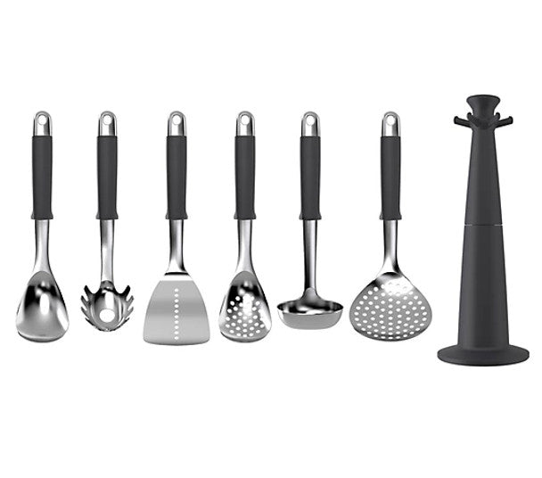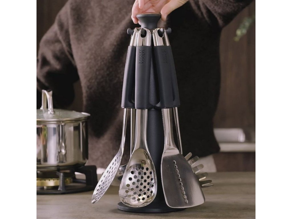 Elevate your cooking experience with the Joseph Joseph Elevate100 Kitchen Utensils Carousel. This set of 6 stainless steel utensils features an elegant design and innovative features that eliminate messy countertops and cross-contamination. With a convenient stand and hooks for storage, this set is a must-have for any kitchen.