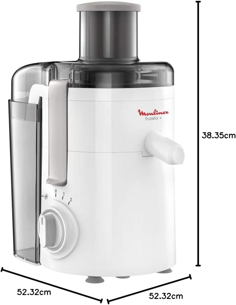 The Moulinex Frutelia + juicer provides perfect results for all your favorite juices, for the easiest way to enjoy healthy, delicious fresh juices every day. A wide opening lets you insert large chunks or entire pieces of fruit with total ease, while 350W of power comes together with 2-speed control and a pulse function for flawless cutting, crushing and mixing.