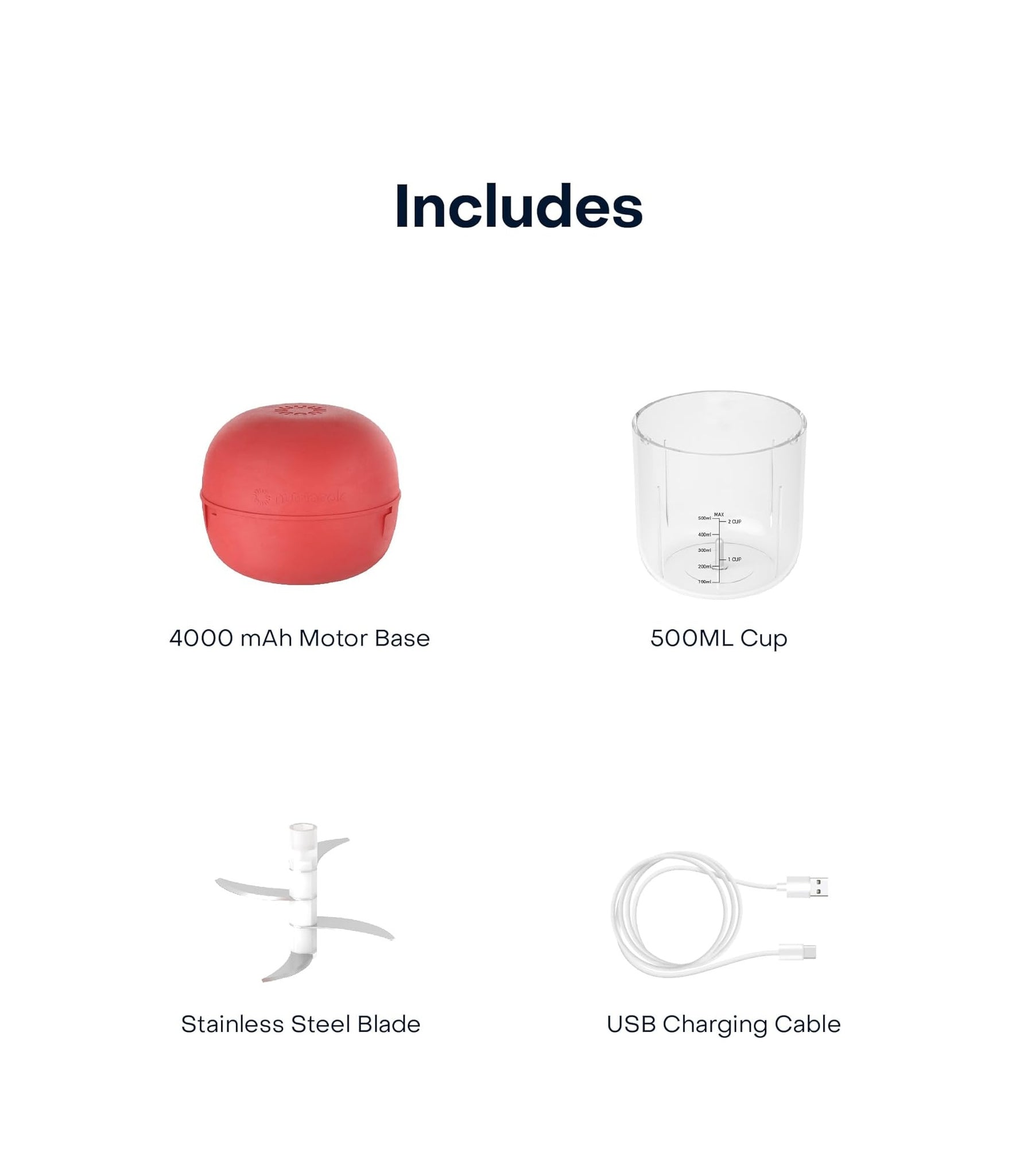 WHAT’S INCLUDED – Motor Base, 500mL BPA-free Tritan cup, SS Quadblade, USB-C Cable, Cleaning Brush.