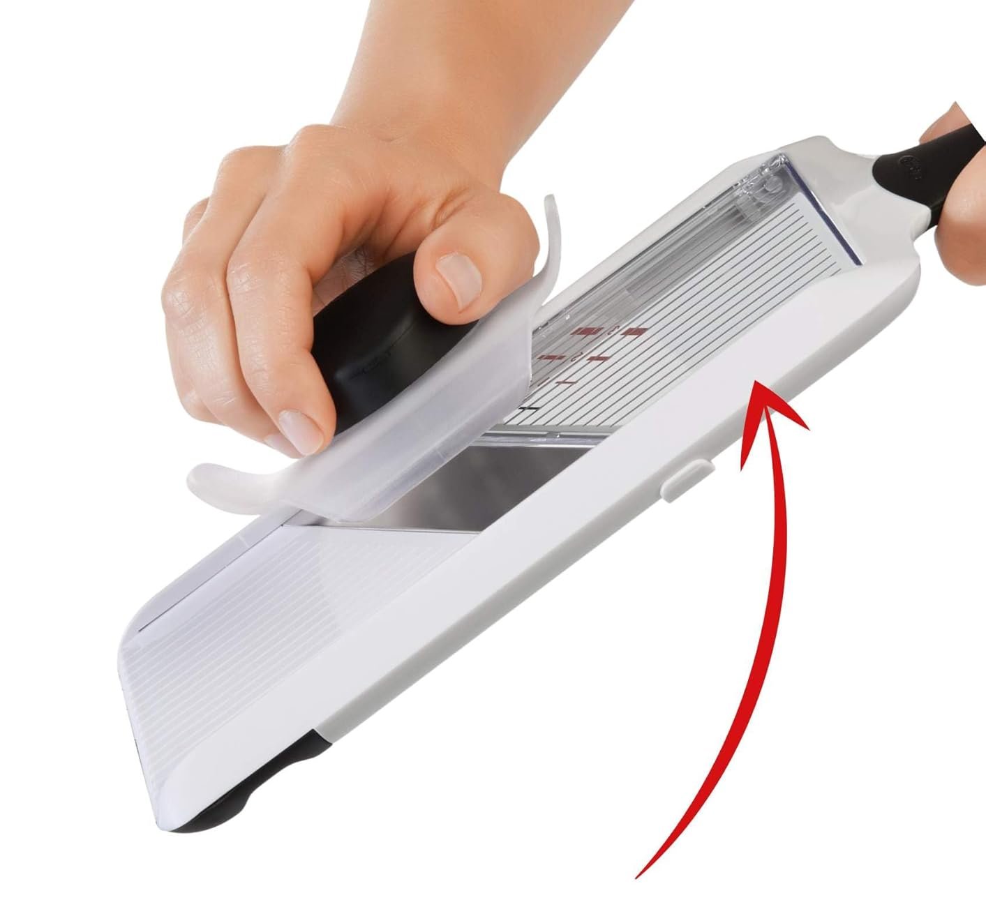 Effortlessly slice your favorite fruits and vegetables with the OXO Good Grips Adjustable Handheld Mandoline Slicer. With adjustable thickness settings of 1mm, 2.5mm, and 4mm, and a secure food holder, you can achieve perfect, even slices every time. The clear surface allows you to monitor your progress with ease. Enhance your cooking experience today.