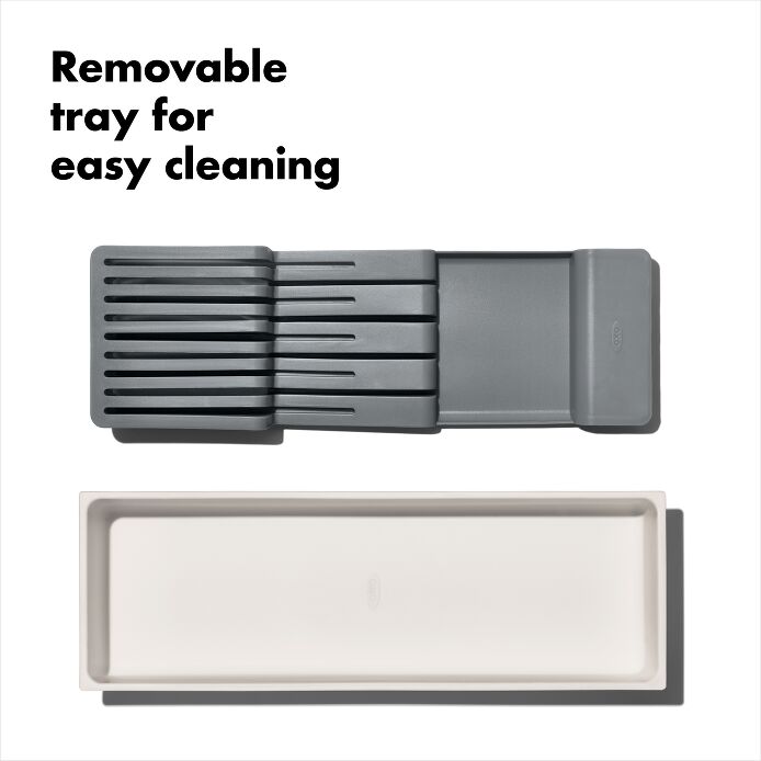 Maximize your drawer space and keep your knives safe with the OXO Good Grips Compact Knife Drawer Organizer. With a space-saving design and non-slip feet, this organizer holds 9 knives and has a removable tray for easy cleaning. Say goodbye to cluttered countertops and protect your blades for longer use.