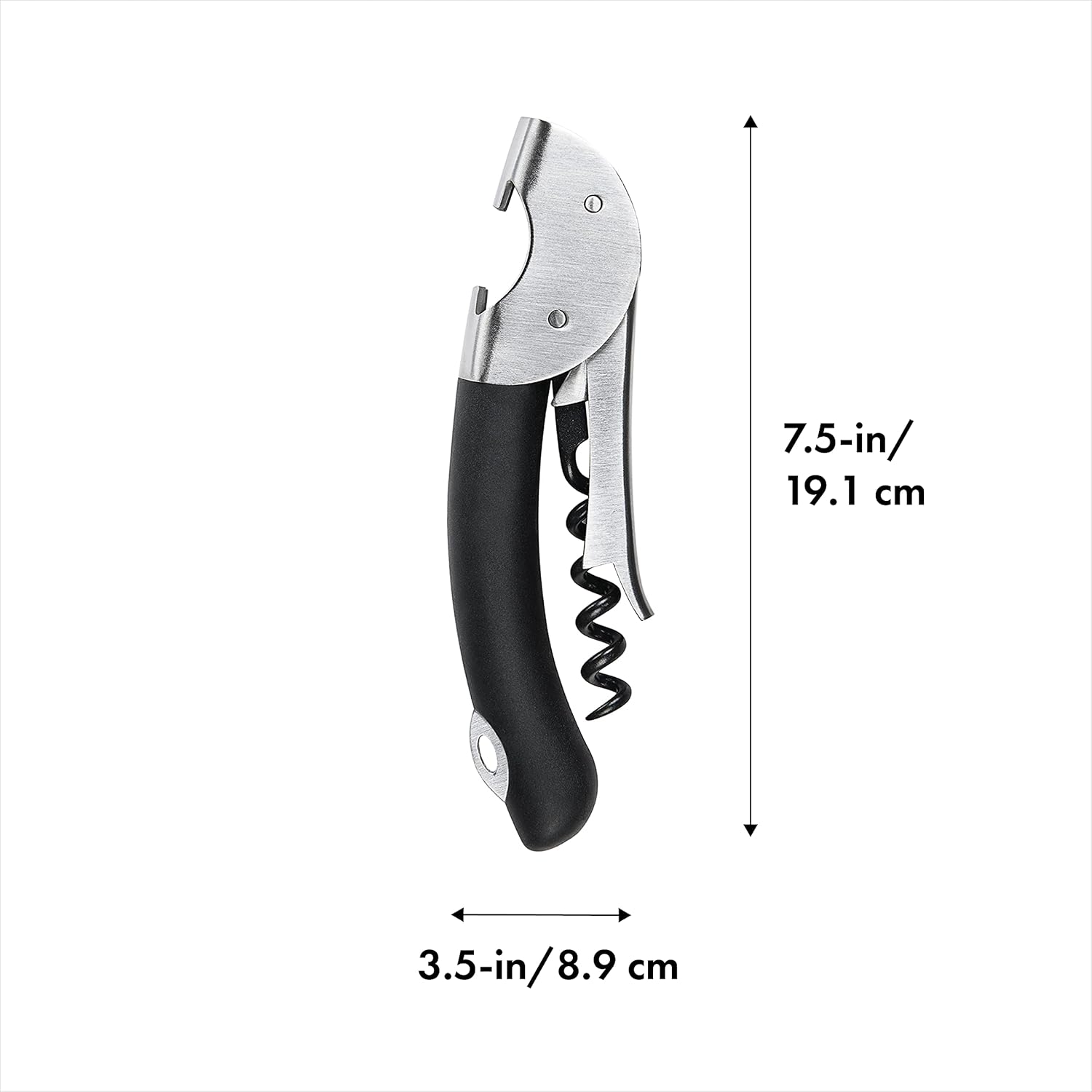 The OXO Good Grips Double Lever Waiter's Corkscrew - Stainless Steel provides extra leverage for effortless removal of corks in just two simple steps. Its stainless steel design offers both elegance and durability, while the soft, non-slip grips ensure a comfortable hold. With a built-in bottle opener and foil cutter, this compact corkscrew is perfect for picnics and travel.
