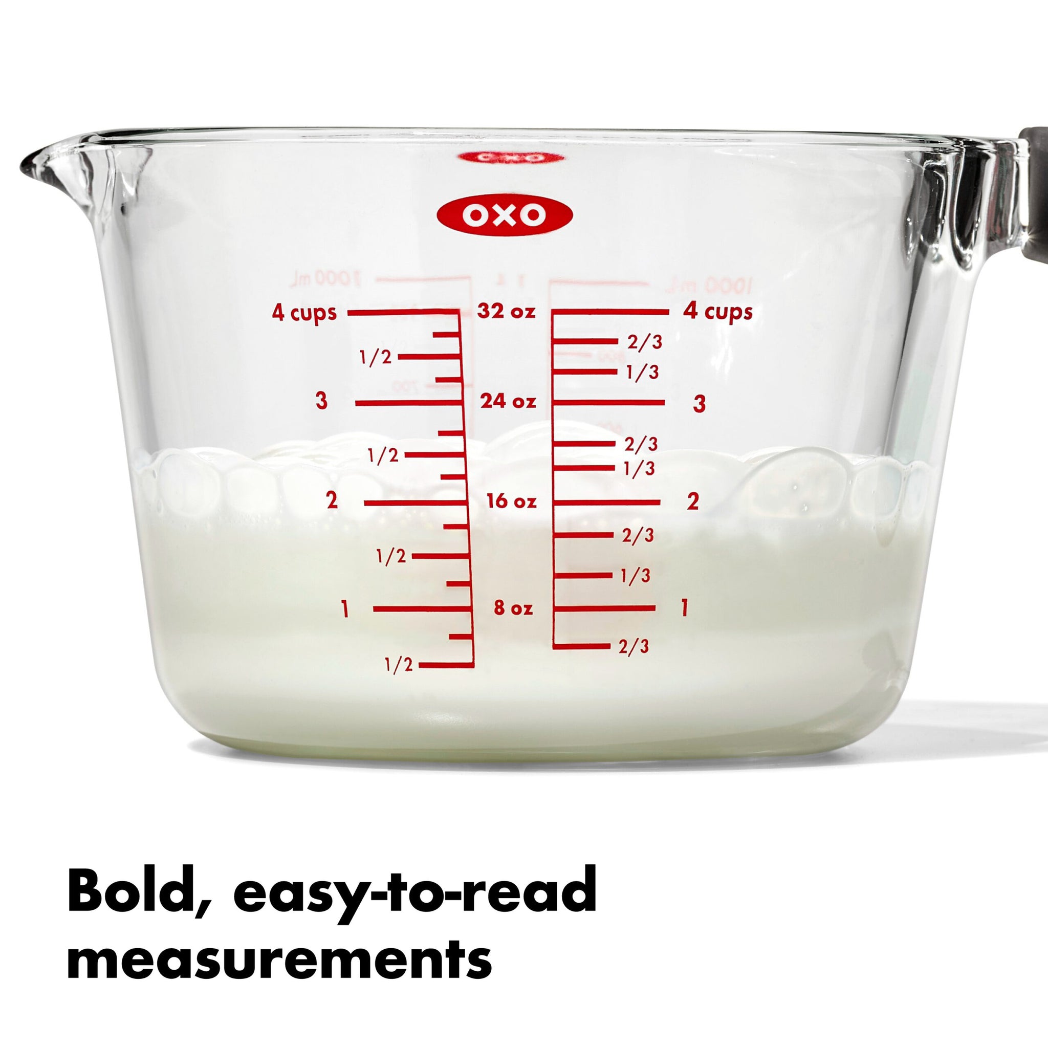 Make measuring, pouring, and storing liquids a breeze with the OXO Good Grips 1000ml Glass Measuring Cup. Its thermal shock resistant Borosilicate glass allows you to take it straight from the fridge to the oven or microwave. With an easy-to-read measurement markings and a non-slip handle, it's the perfect addition to any kitchen.