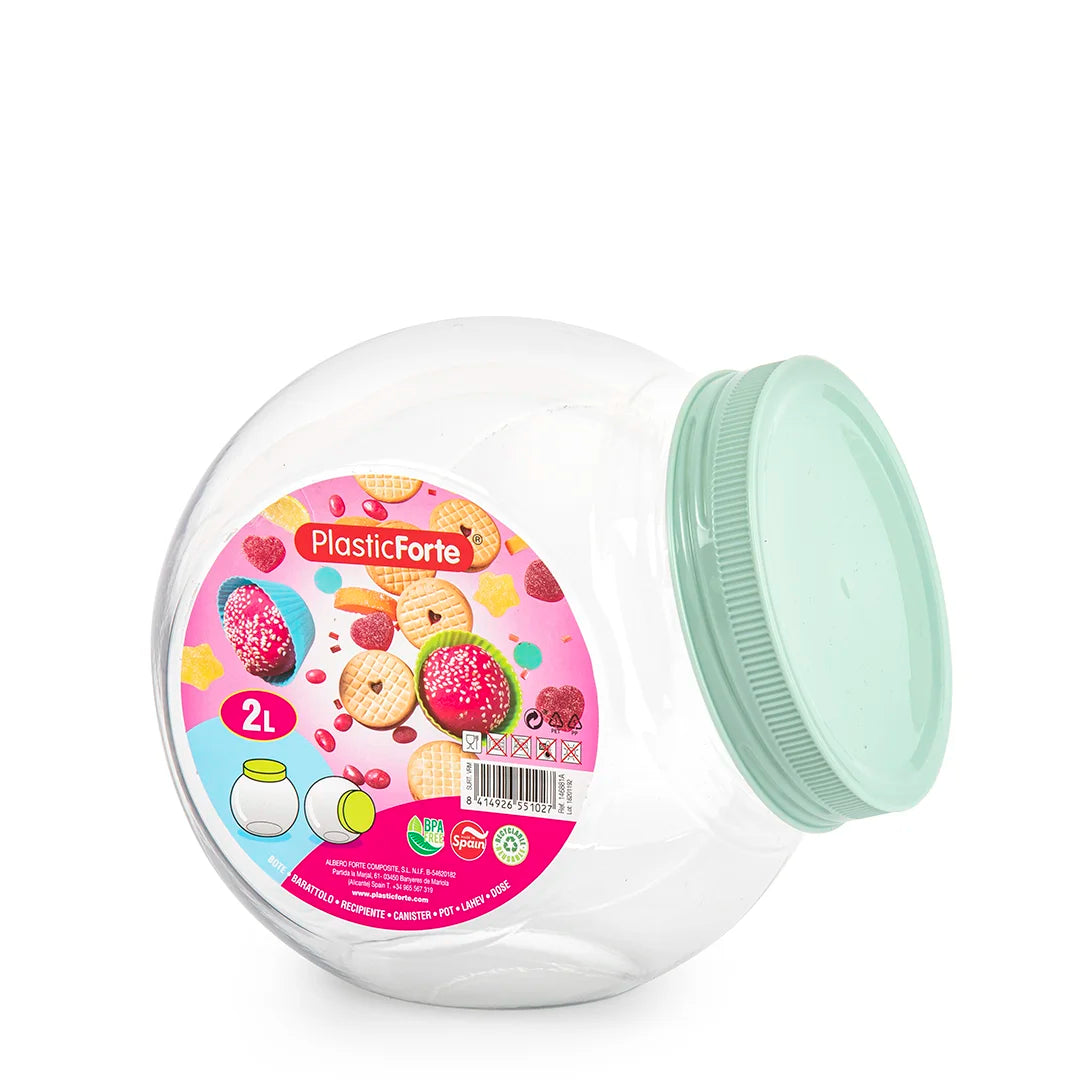 Keep your favorite candies fresh and organized with this elegant Plastic Forte Classic Candy Canister. Featuring a spacious 2-liter capacity, this durable plastic container combines a transparent base with your choice of colored lids—green, pink, or taupe—to complement any kitchen décor. The oval shape and compact 12.5 x 17 x 17cm dimensions fit perfectly on shelves or countertops. Crafted in Spain with quality construction, it's an ideal solution for pantry storage and keeping treats
