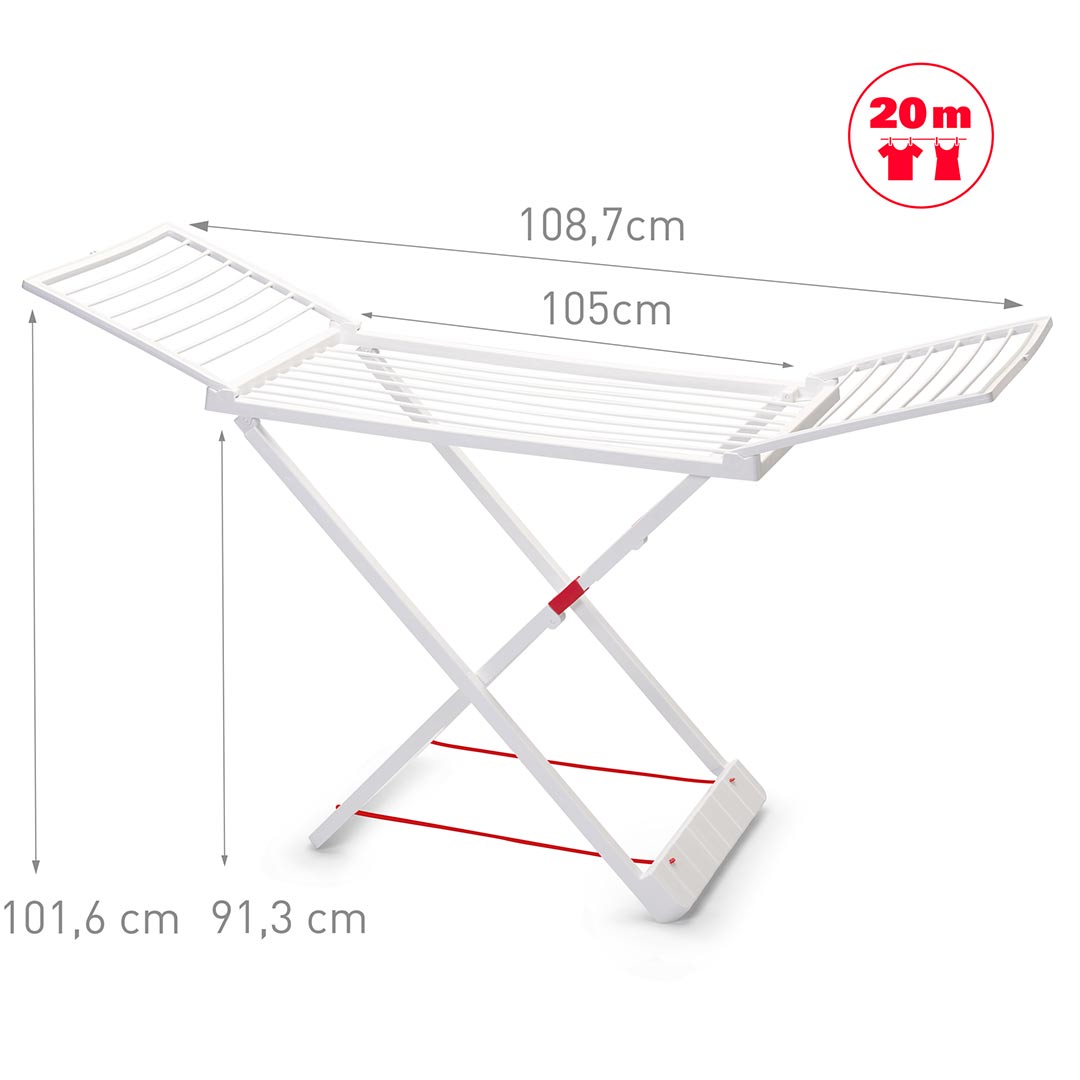 This Plastic Forte clothes drying rack has dimensions of 55 x 180 x 108cm. It is made of high quality plastic. It holds up to 20 meters of fabric. It has a lock system for safety.