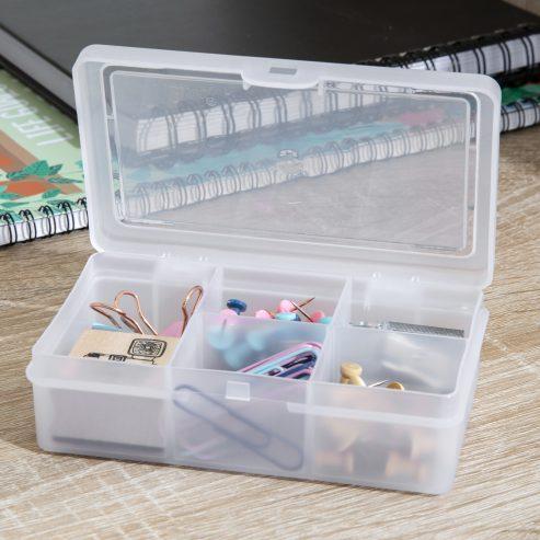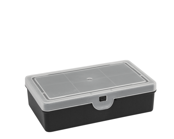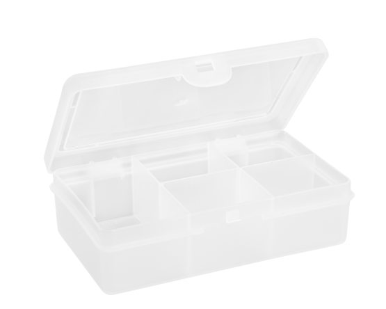 Handy organizer box with assorted sized compartments. Secure hinged lid and integral dividers ensure contents stay where they should. Clear lid to easily view inside. Hardwearing and durable. Uses: