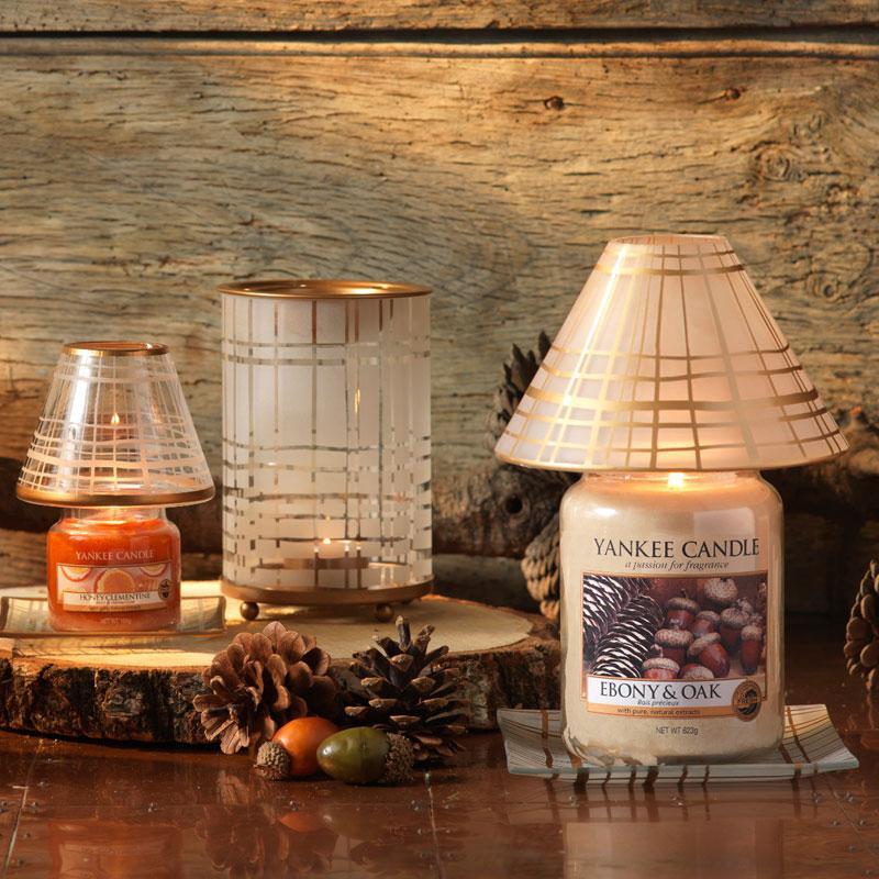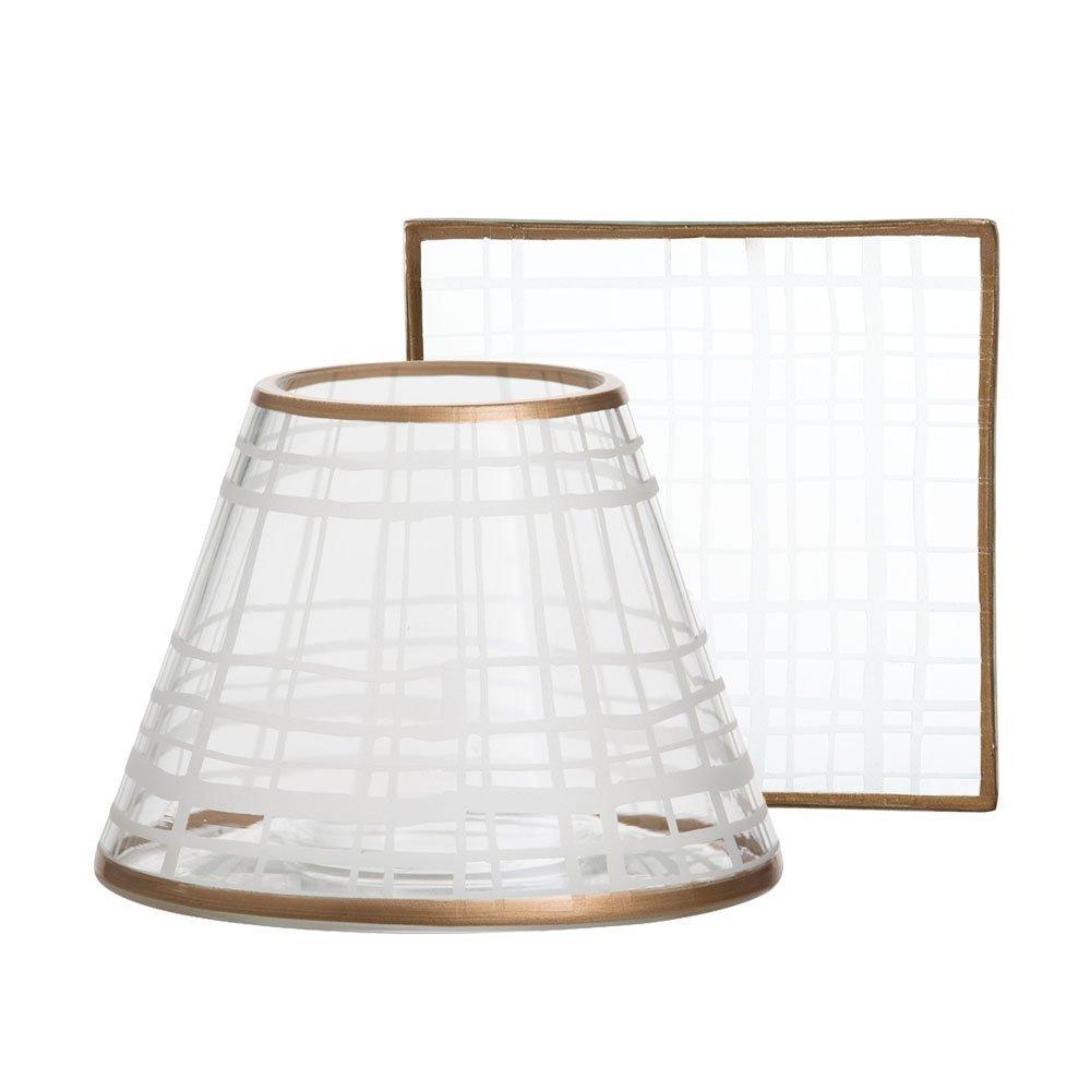 Our Shade and Tray Combo Sets are the perfect way to decorate your candles in style. Striking, asymmetrical crosshatching in elegant bronze decorates the frosted glass of this shade and tray set. Suitable for use with Yankee Candle Small Jar Candles to help protect surfaces and encourage an even burn.