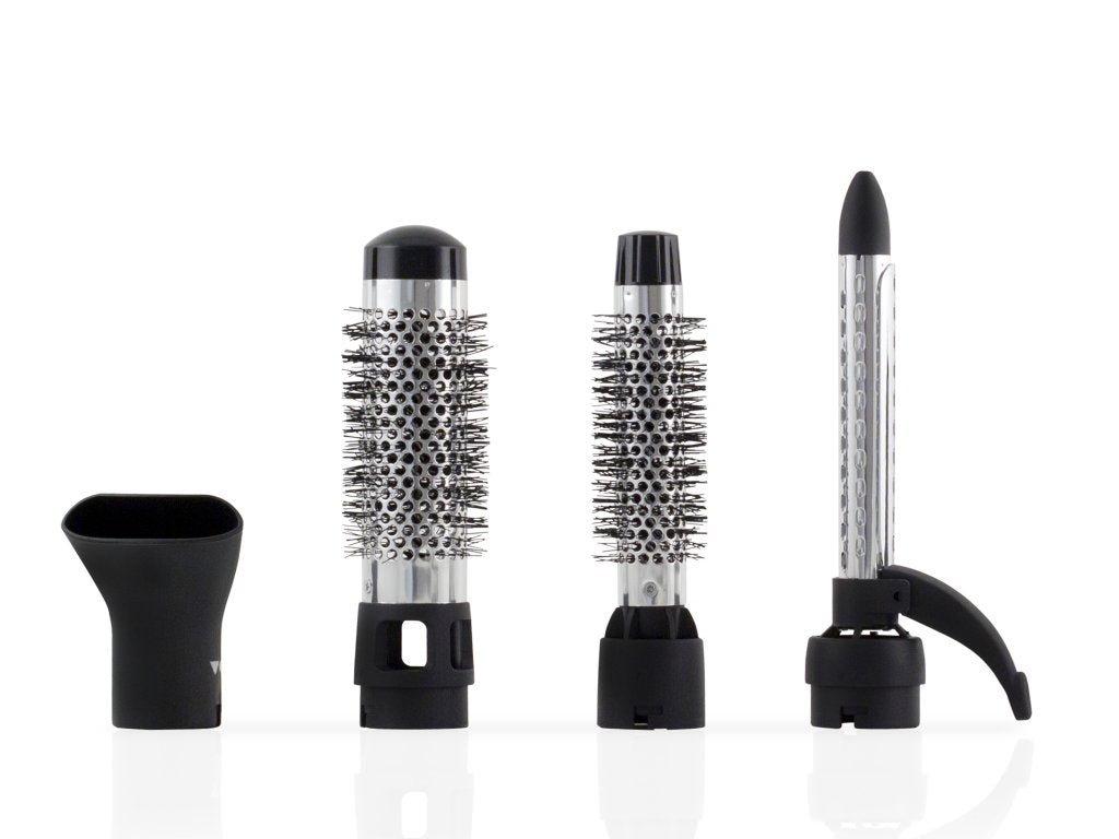 Hair brush with a ceramic coating and has 2 adjustable temperature settings. Comes with 4 different heads for desired hair style.