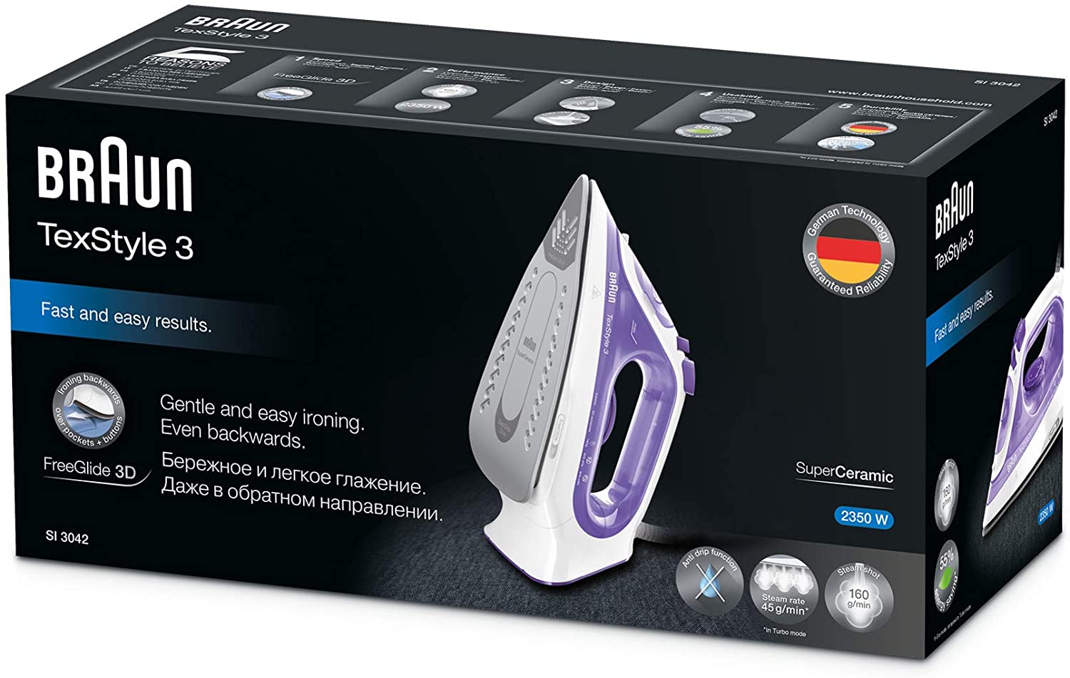 The Braun TexStyle 3 has been upgraded with a fresh new look, more power and better steam performance. Now featuring the world's first FreeGlide 3D technology for 360degree glide ability.
