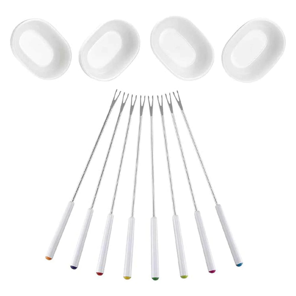 With removable pot with non-stick coating. Includes 8 nickel-plated steel forks with insulating handle and color indicator